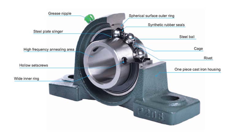 Deze units zijn een combinatie van radiale kogellagers, afdichting en een behuizing van hoogwaardig gietijzer of geperst staal in verschillende vormen. Het buitenoppervlak van het bijpassende lager en het binnenoppervlak van de behuizing zijn bolvormig, zodat de eenheid zelfuitlijnend is.